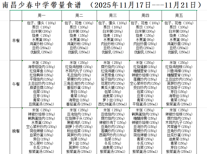 南昌少春中学带量食谱 (2025年11月17日---11月21日)