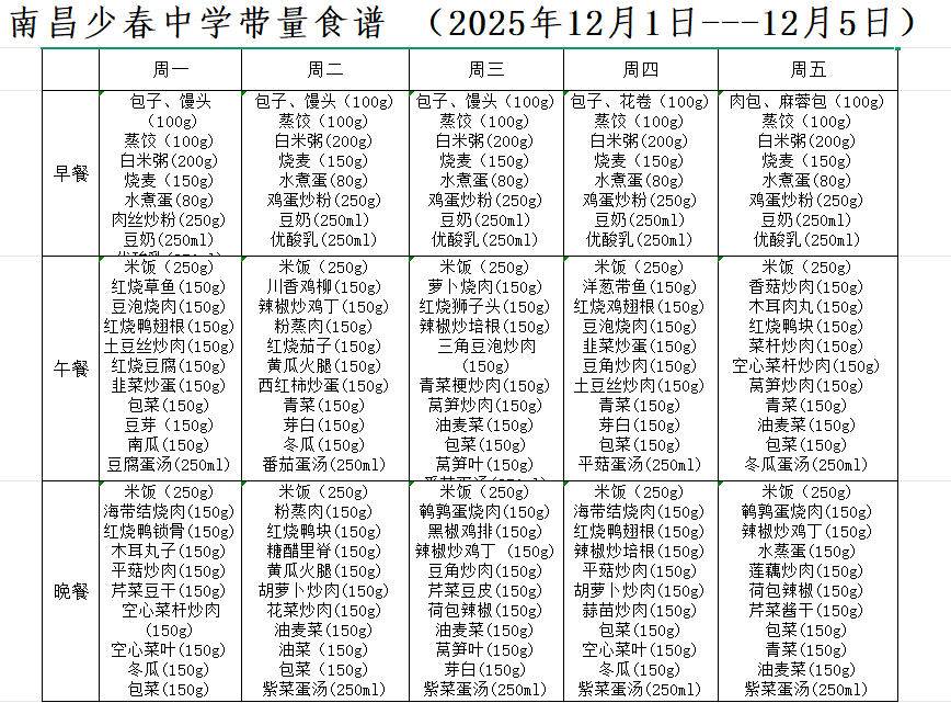 南昌少春中学带量食谱 (2025年12月1日---12月12日)