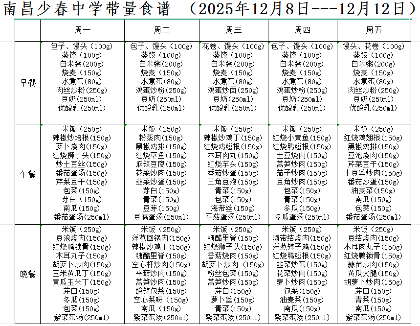 南昌少春中学带量食谱 (2025年12月1日---12月12日)