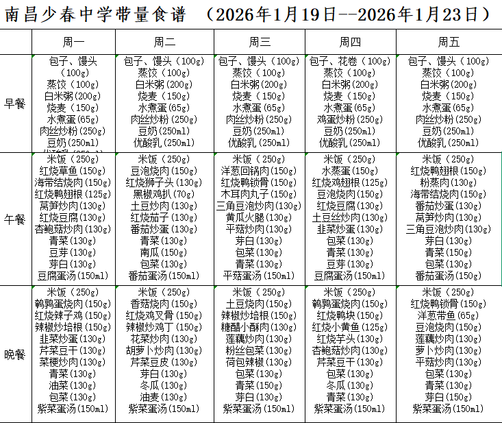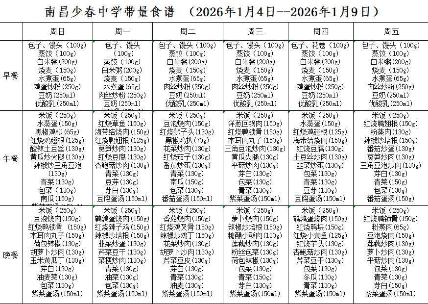南昌少春中学带量食谱 (2026年1月4日--2026年1月30日)