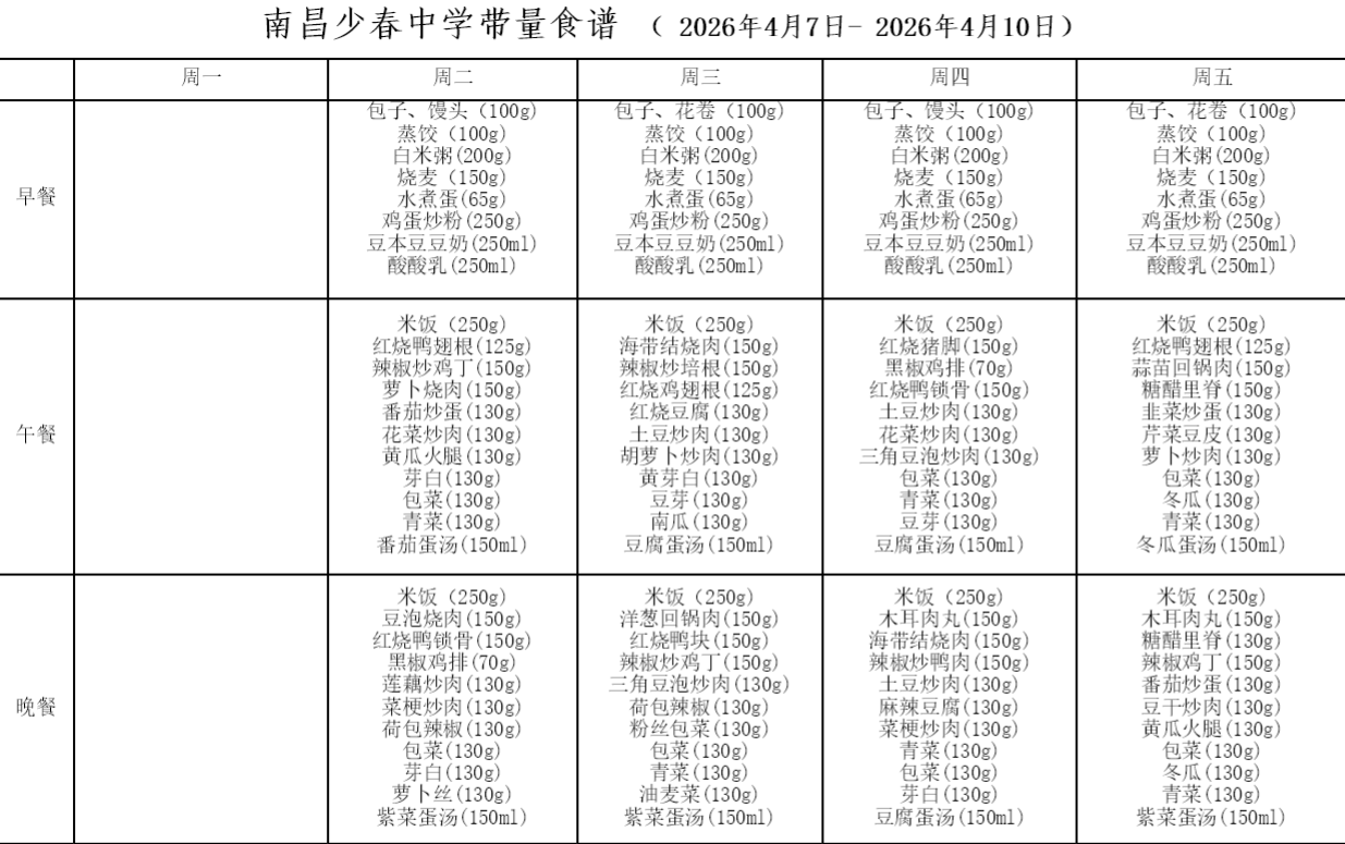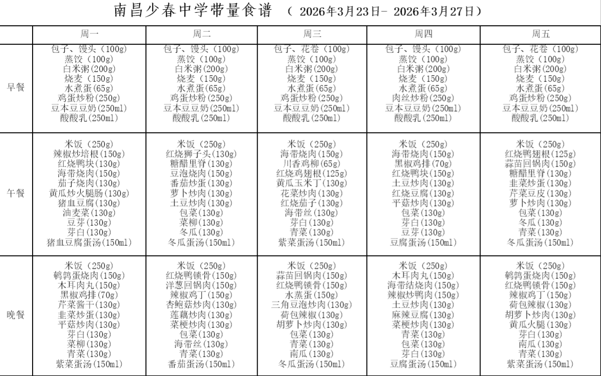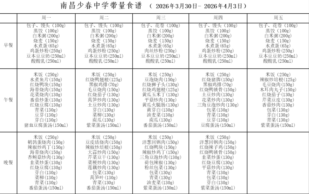 南昌少春中学带量食谱(2026年3月26日-4月10日)